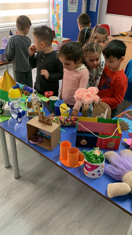 Uygulama ve Yaratım: Öğrenciler, aileleriyle birlikte belirledikleri tasarımları atık malzemeleri kullanarak hayata geçirmişlerdir.